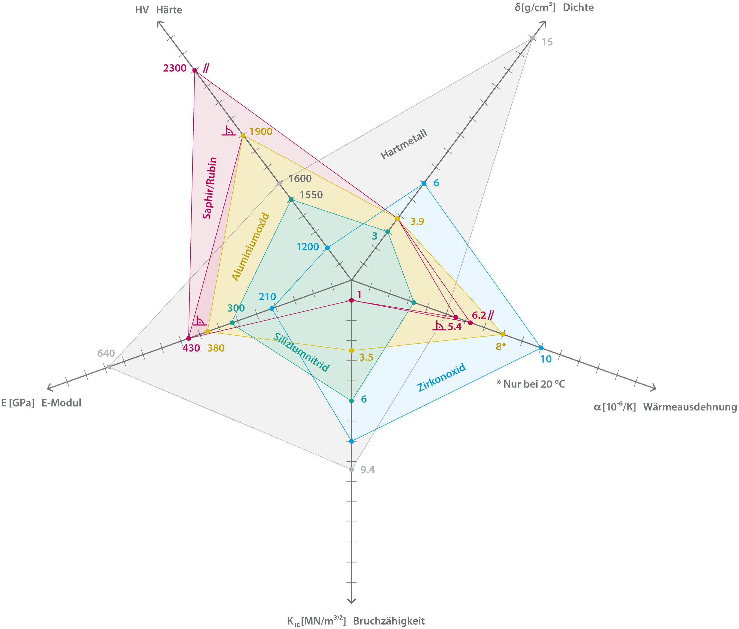 Aluminiumoxid (Al2O3) Vereinfacht als Keramik bezeichnet, ist dies der am häufigsten eingesetzte keramische Hochleistungswerkstoff. Sehr grosse Härte, guter Isolator. Die Reinheit verbessert die mechanischen Eigenschaften, deshalb verwendet Saphirwerk überwiegend hochreines Al2O3.